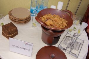 Indonézska kuchyňa je jednoduchá, rôznorodá, pikantná a veľmi chutná. Bez ohľadu na regionálne rozdiely je založená na čerstvých, originálnych surovinách: ryži, rybách, morských plodoch (krevety), mäse, tropickom ovocí, zelenine a koreninách. Ryža (nasi) nie je iba základnou potravinou, ale je aj základom každého jedla. A pretože sa varí v pare, alebo praží, je obzvlášť aromatická a chutná. V Indonézii sa na prípravu jedál používa výnimočne veľa korenín a ich zmesí, obľúbené chute sú korenistá, ostrá a sladko – kyslá. Z prísad sú nevyhnutné cesnak, cibuľa, čierne korenie, čili, zázvor, klinčeky, rímska rasca, koriander, citrónová tráva a kurkuma, ktoré sú základom početných zmesí, medzi ktorými je aj kari. Preto sa nikto nečuduje, že spolu s osobitnou panvicou, nazývanou wok (wadjan), najdôležitejšie kuchynské náčinie je drevený, alebo kamenný mažiar (ulekan, alebo tjobek) na korenie. Prechádza z generácie na generáciu a čím je starší a viac sa používa, tým je lepší a silnejšie vonia.