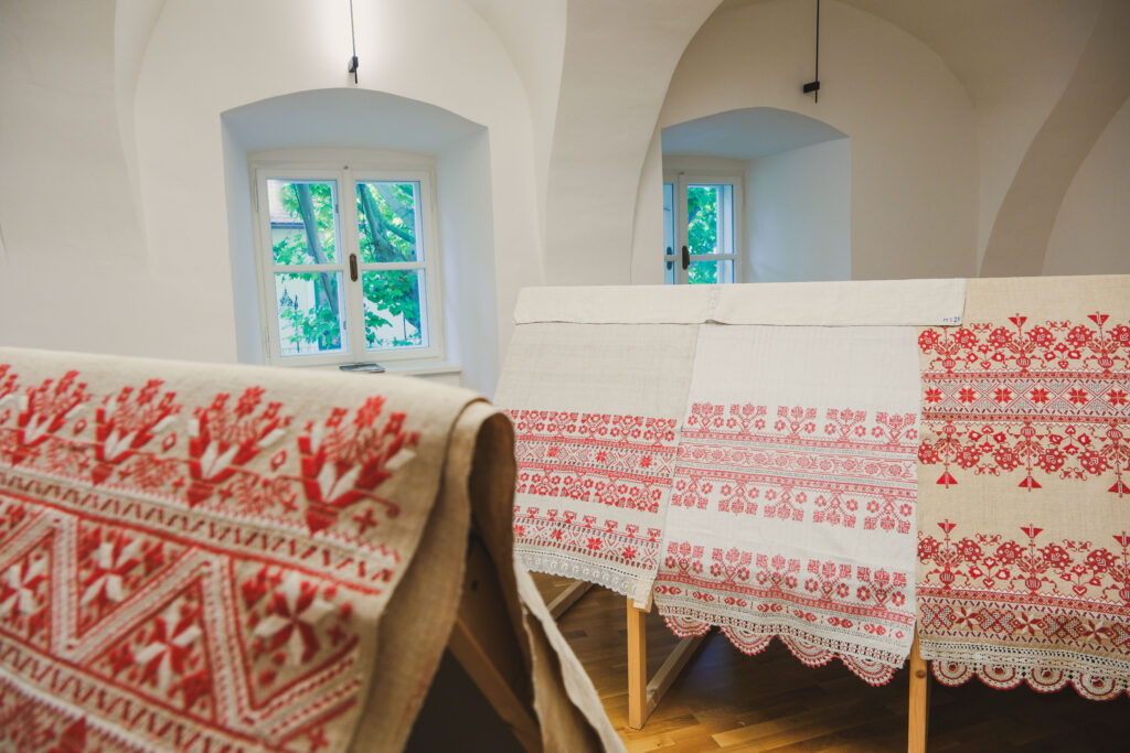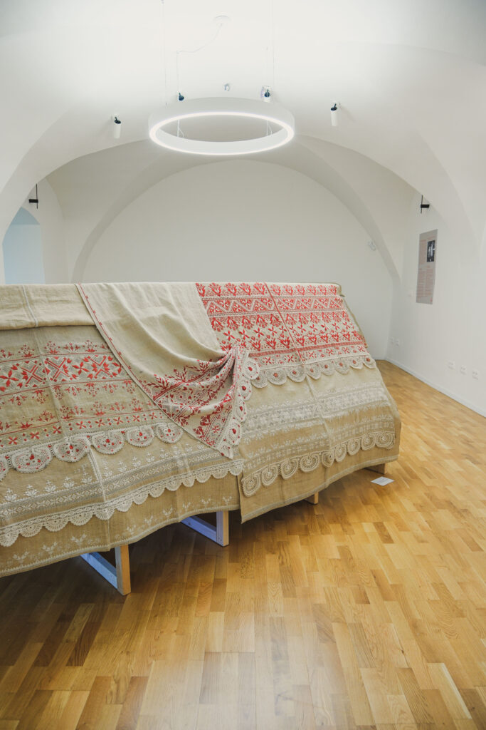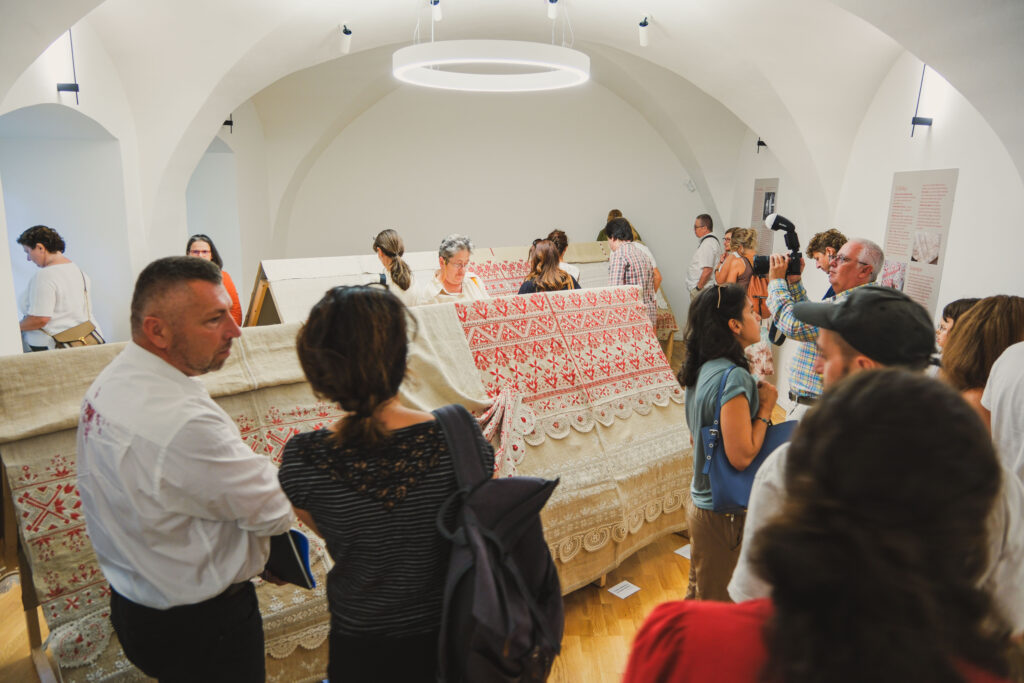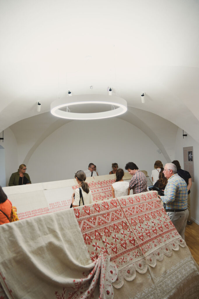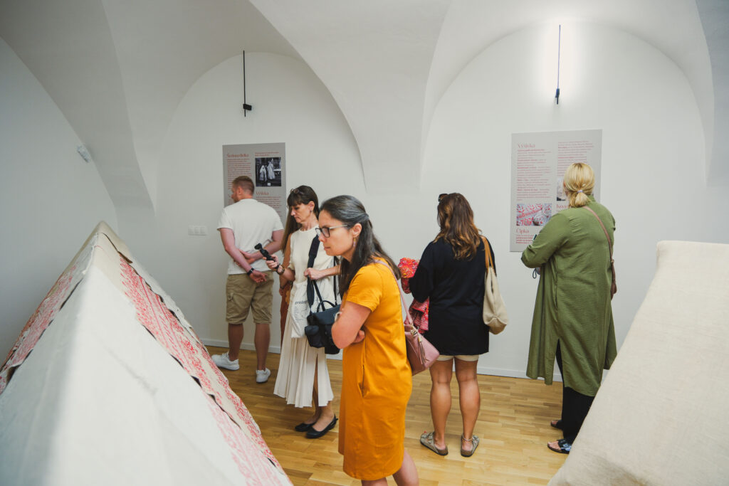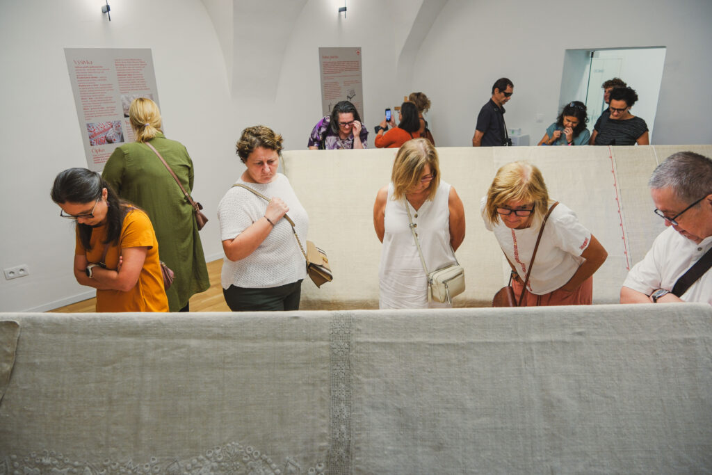 Výstava ponúka aj participatívny prvok – veľkú konopnú plachtu, ktorú spoločne vyšívajú návštevníci červenou a bielou niťou. Prvé stehy už pribudli a plachta sa postupne mení na kolektívne dielo. Návštevníci si môžu vybrať, či budú pokračovať v tradičných vzoroch, alebo pridajú vlastný motív. Materiály sú k dispozícii priamo v kaštieli.
